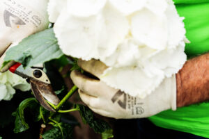 Zo’n vier hectare beslaan de kassen van Gommers Hortensia in Sprang-Capelle. Ze staan bomvol bloeiende snijhortensia’s. Tien soorten in totaal, in verschillende kleuren en maten. De favoriet van Abdalrhman – bij Gommers is zijn ‘roepnaam’ Somaff – is de Verena. ‘Die diep-roze kleur is prachtig.’ Abdalrhman vertelt vol trots over zijn werk. ‘Het duurt lang voordat je weet waar je op moet letten bij het snijden: de grootte van de bloem, de kleur, de versheid, de dikte en lengte van de stengel. Het is veel. Maar mooi!’ ‘Herinner je je de eerste keer snijden nog?’, vraagt Erik lachend. ‘Ik ging kijken en zag een gang vol bloemen die je er niet af had mogen halen.’