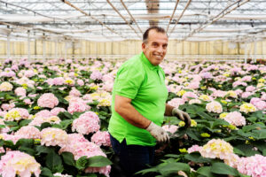 Zo’n vier hectare beslaan de kassen van Gommers Hortensia in Sprang-Capelle. Ze staan bomvol bloeiende snijhortensia’s. Tien soorten in totaal, in verschillende kleuren en maten. De favoriet van Abdalrhman – bij Gommers is zijn ‘roepnaam’ Somaff – is de Verena. ‘Die diep-roze kleur is prachtig.’ Abdalrhman vertelt vol trots over zijn werk. ‘Het duurt lang voordat je weet waar je op moet letten bij het snijden: de grootte van de bloem, de kleur, de versheid, de dikte en lengte van de stengel. Het is veel. Maar mooi!’ ‘Herinner je je de eerste keer snijden nog?’, vraagt Erik lachend. ‘Ik ging kijken en zag een gang vol bloemen die je er niet af had mogen halen.’