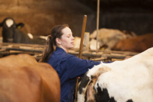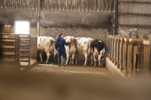 AB komt op haar pad tijdens een stage. Ze heeft dan al gezien dat ze geen eigen boerenbedrijf wil gaan runnen. ‘Teveel papierwerk. Ik wil gewoon lekker met de dieren bezig zijn’, vertelt Jessie. En dat doet ze nu, dagelijks. Haar werktijden zijn heel verschillend en afhankelijk van de werkzaamheden die er bij ‘haar’ koeien te doen zijn. Melken, voeren, kuilen bloot maken, zieke koeien verzorgen etc.