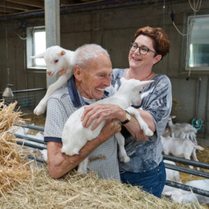 Aaibare geiten en een betekenisvolle dagbesteding voor ouderen gaan perfect samen op biologisch melkgeitenbedrijf en zorgboerderij Ravensbosch. Eigenaren Maurice en Clemence Dezaire hebben hun manier van ondernemen gevonden, mogelijk gemaakt dankzij de mensen die AB Werkt voor ze vindt.